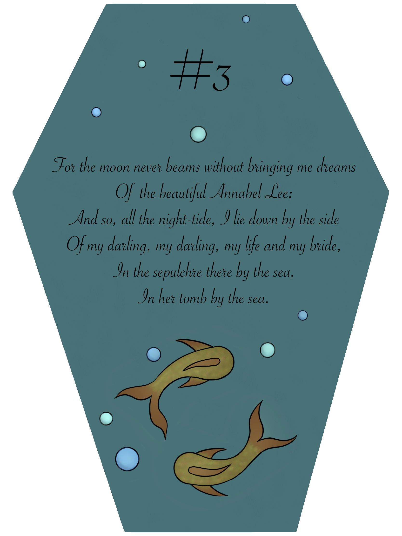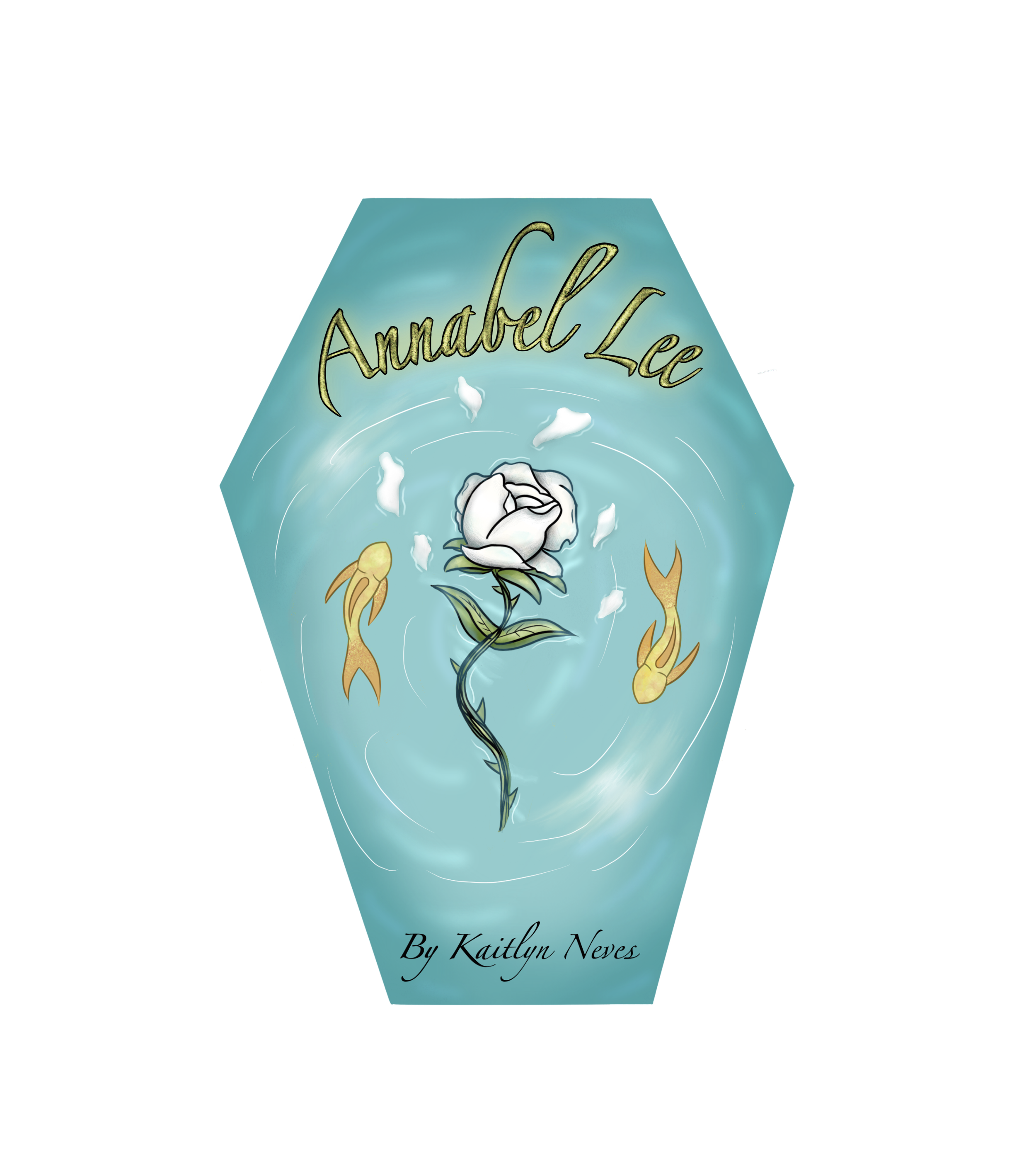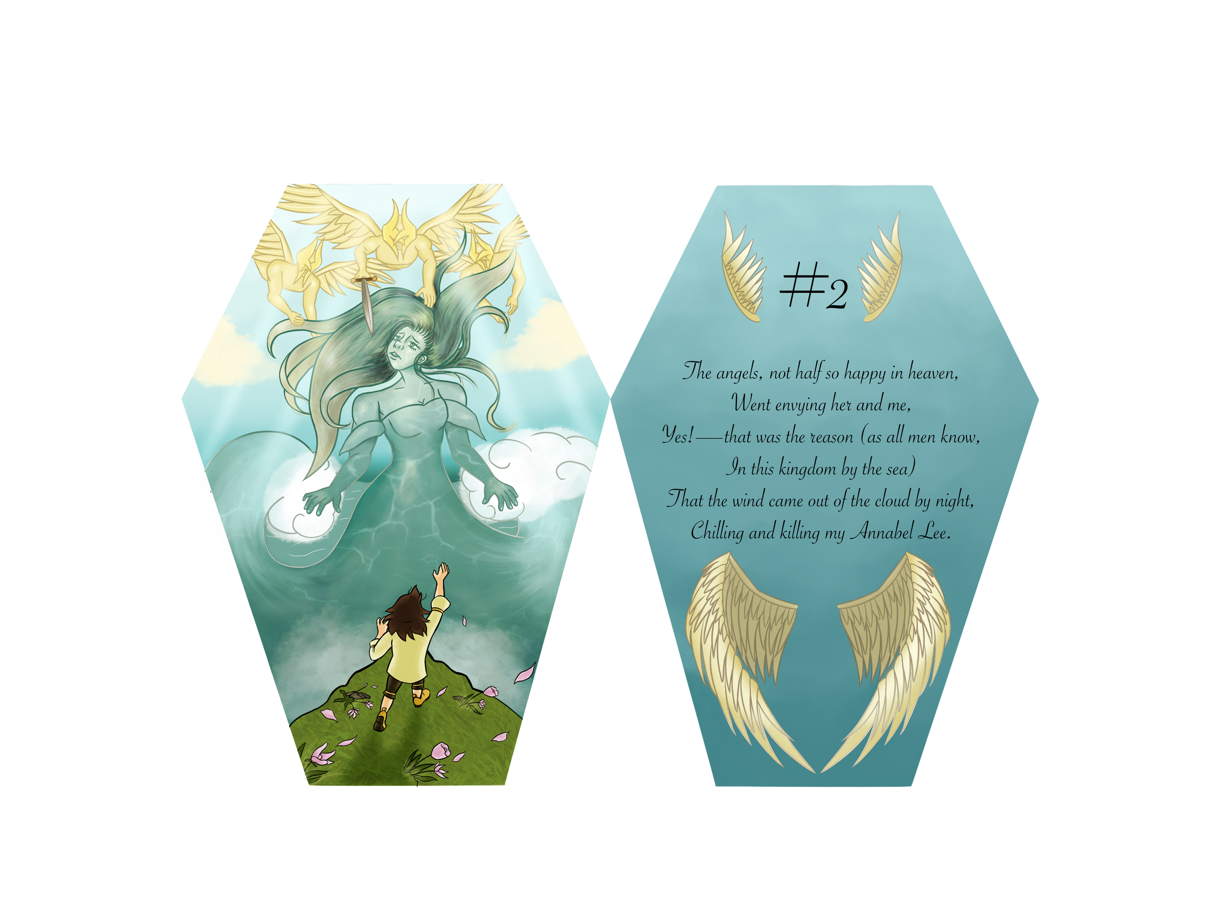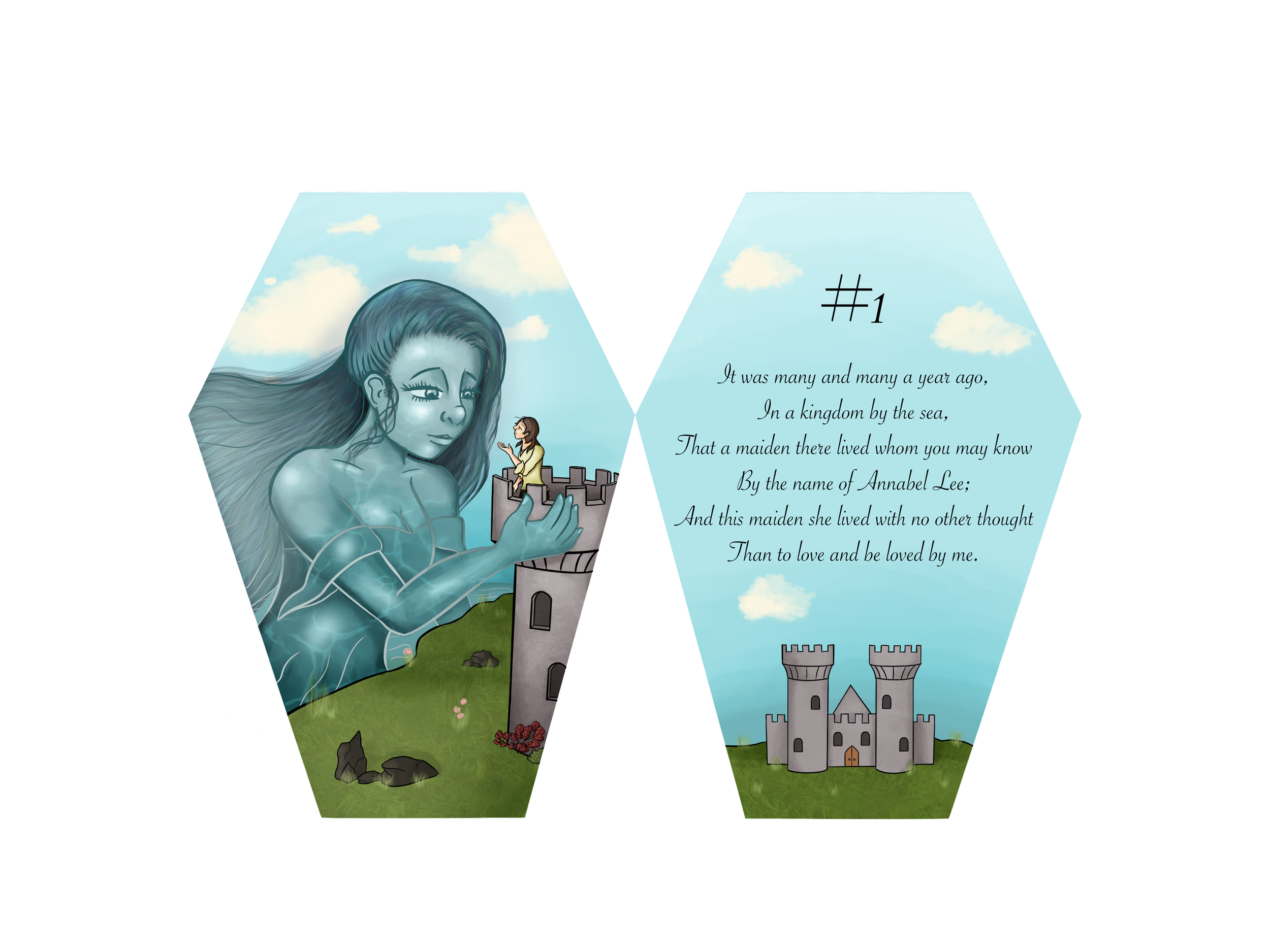 Annabel Lee is a zine modeled after the poem of the same name by Edgar Allan Poe. Imagining the character of Annabel as an ethereal goddess of water is really what set this project in motion. The zine is comprised of 3 double sided panels (or cards) with the front and back covers acting as a folder to contain them.