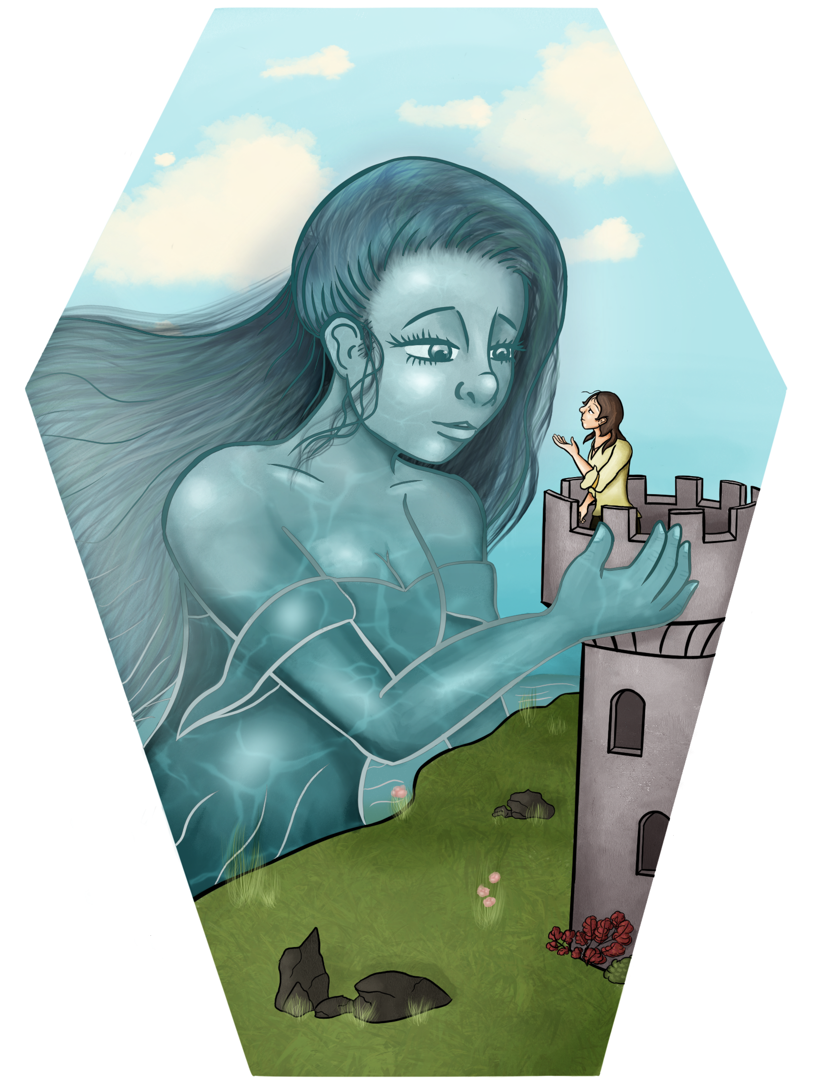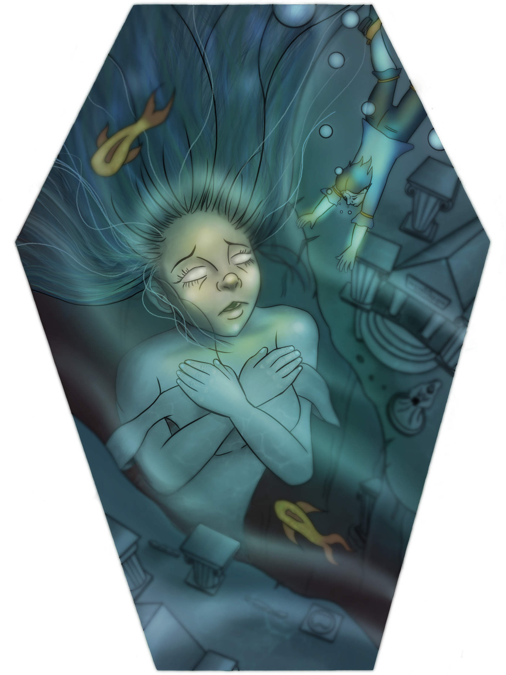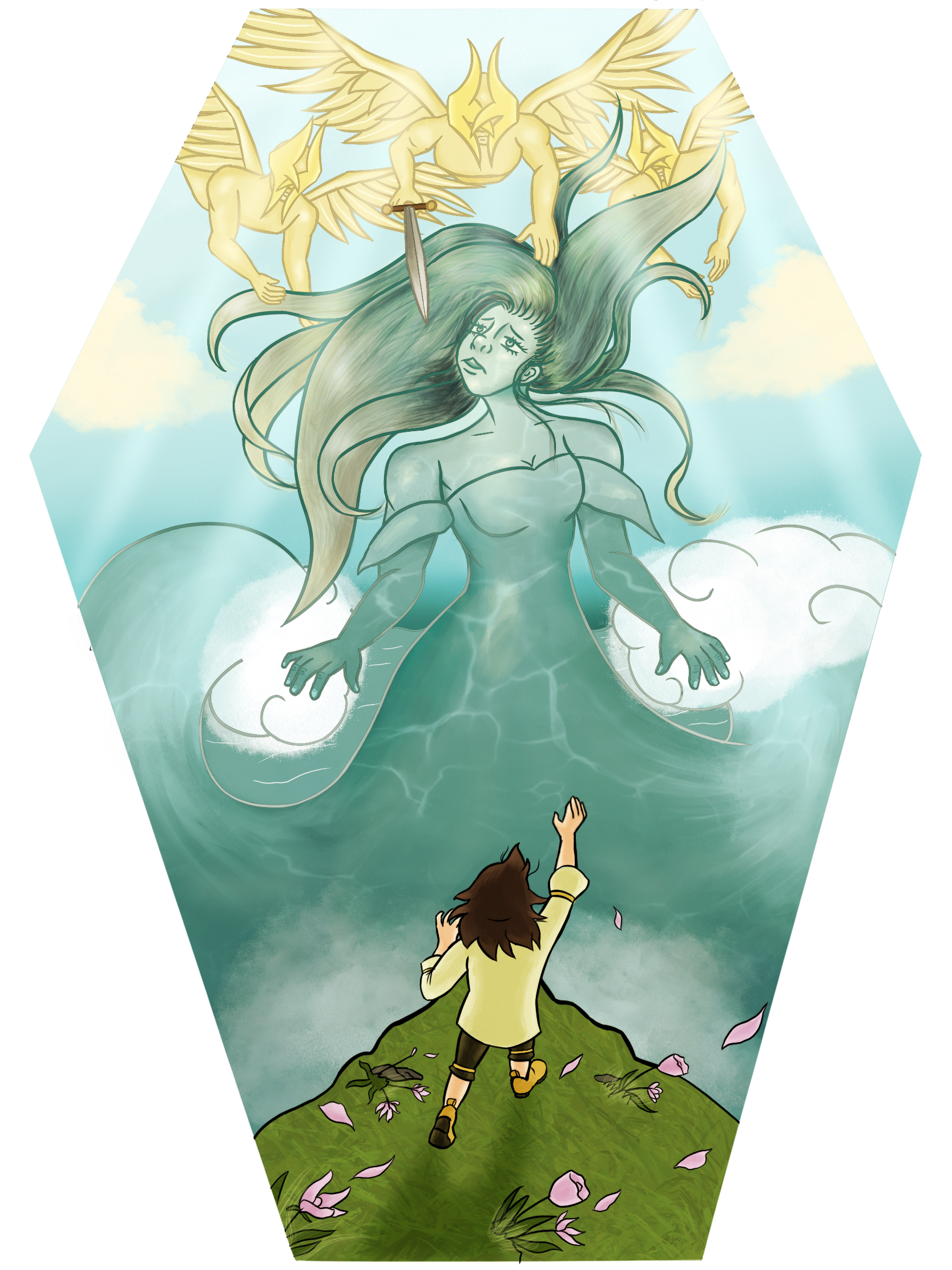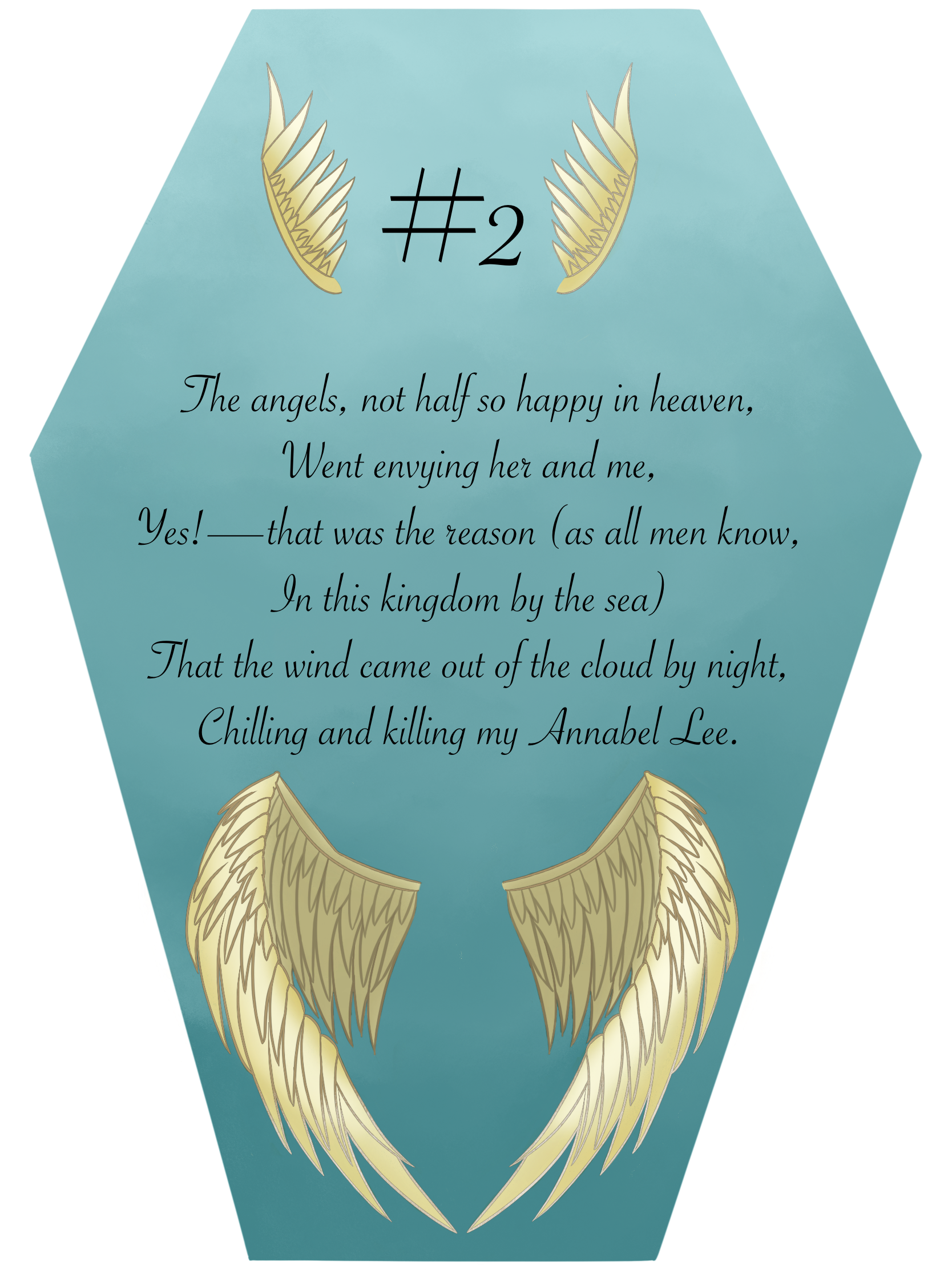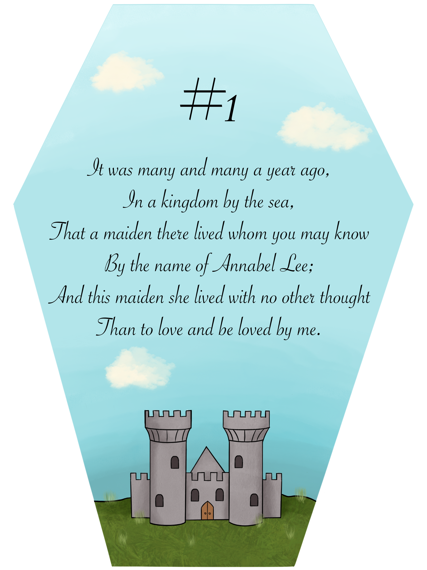 Annabel Lee is a zine modeled after the poem of the same name by Edgar Allan Poe. Imagining the character of Annabel as an ethereal goddess of water is really what set this project in motion. The zine is comprised of 3 double sided panels (or cards) with the front and back covers acting as a folder to contain them.